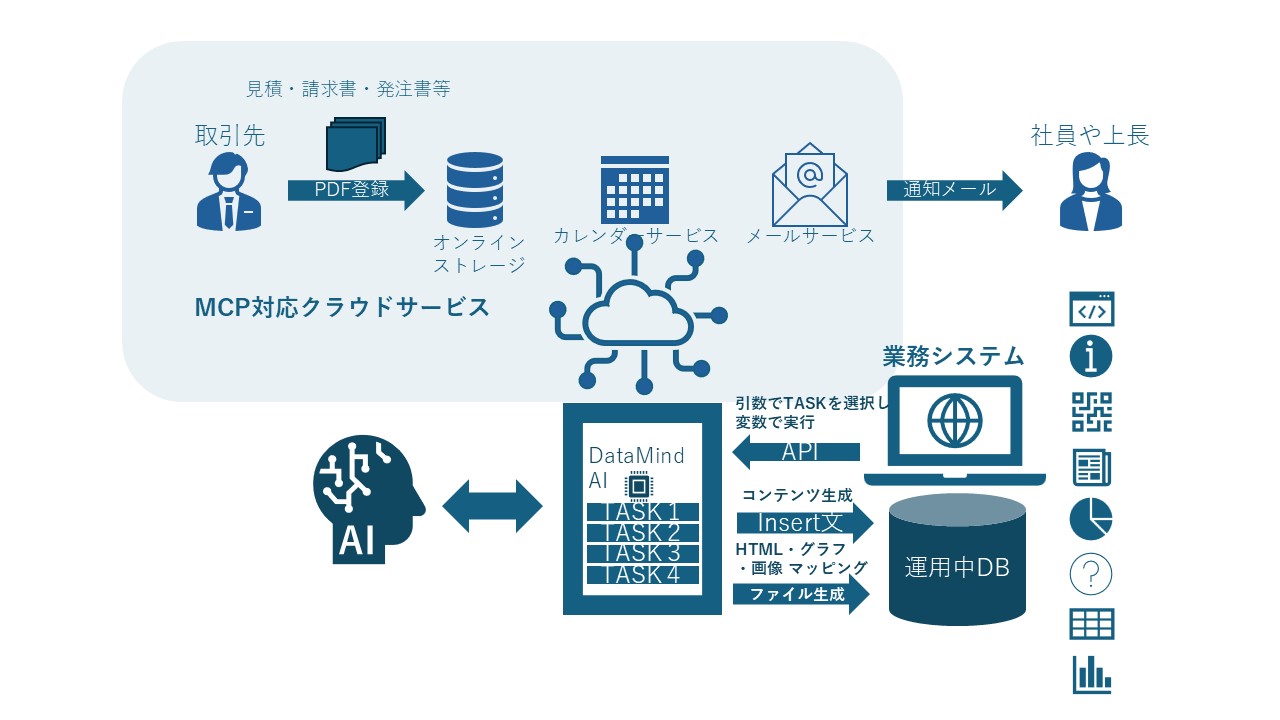 こうした業務フローを実現するのはこれまでかなりの開発コストがかかていましたが、DataMind AIを活用すればAIに対するプロンプトのチューニングで多くの機能を実現できるうえ、 必要なリソースはクラウド上のSaaSを活用できますのでローコストかつ究極のノーコード開発システムと言えるでしょう。